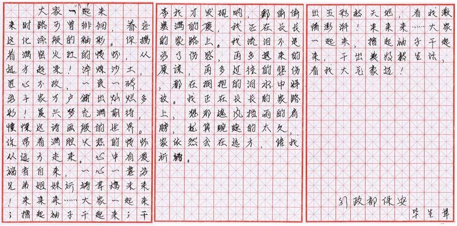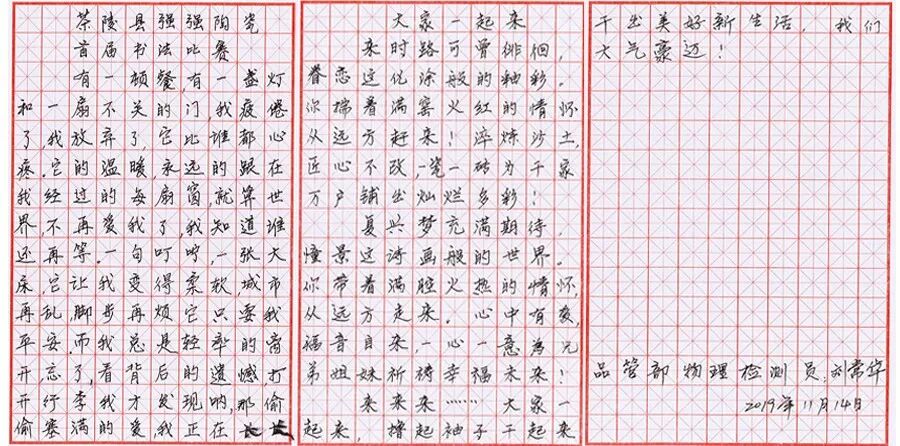我们这次比赛的内容有散文一段,还有一曲强强陶瓷厂歌《大家一起来》歌词。